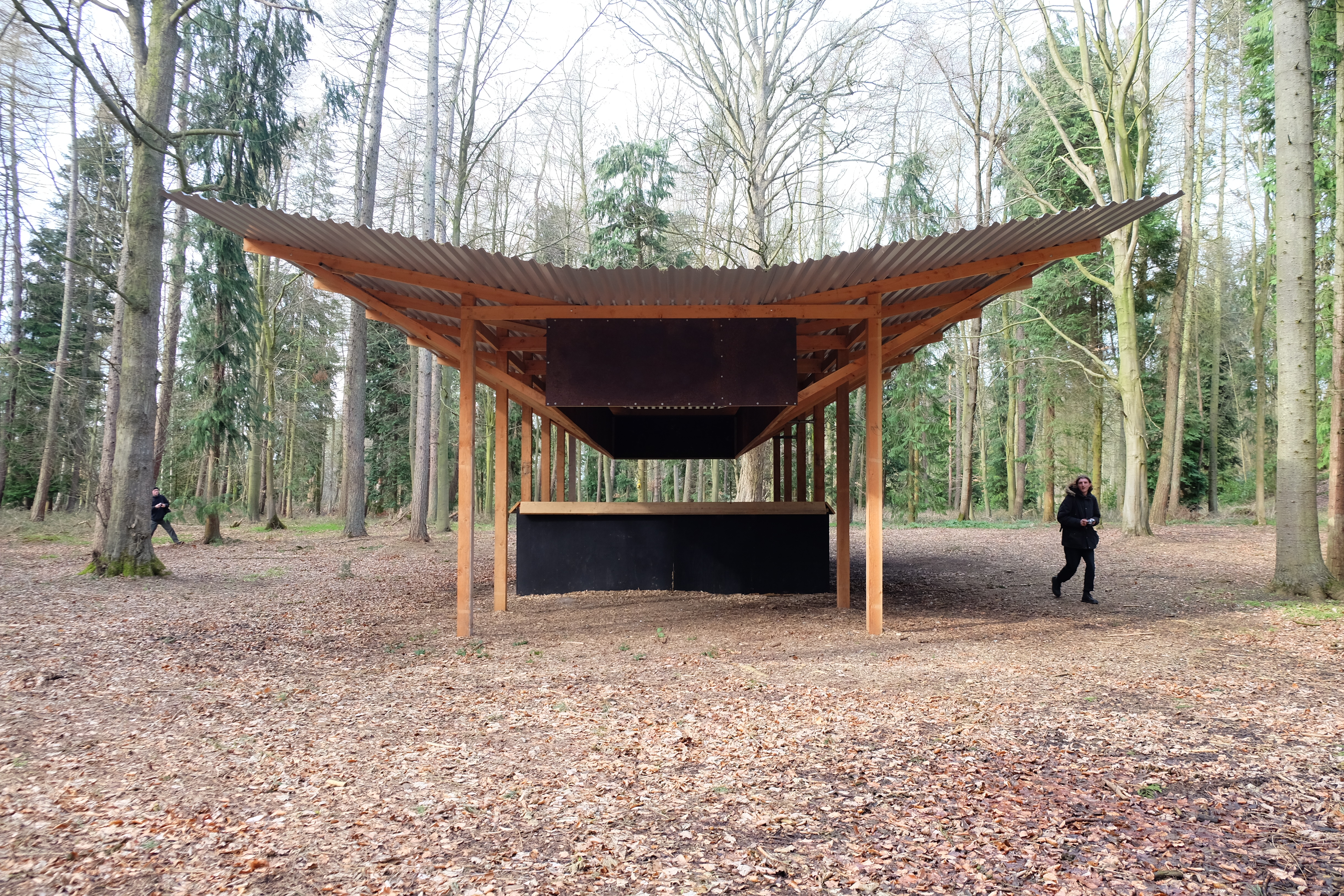 The design hoped to create varied scales of intimacy. From a distance, one experiences the woods and views the structure within its setting. When moving closer, the wings provide a roof and ensure a smooth transition between the woodland and the cosy space within. Here, it feels intimate below a Corten-clad case, as though one is inside a small underground room. The stage is primarily a tunnel, composed via a series of repetitive timber frames. The tunnel supports a large canopy and a suspended space within.